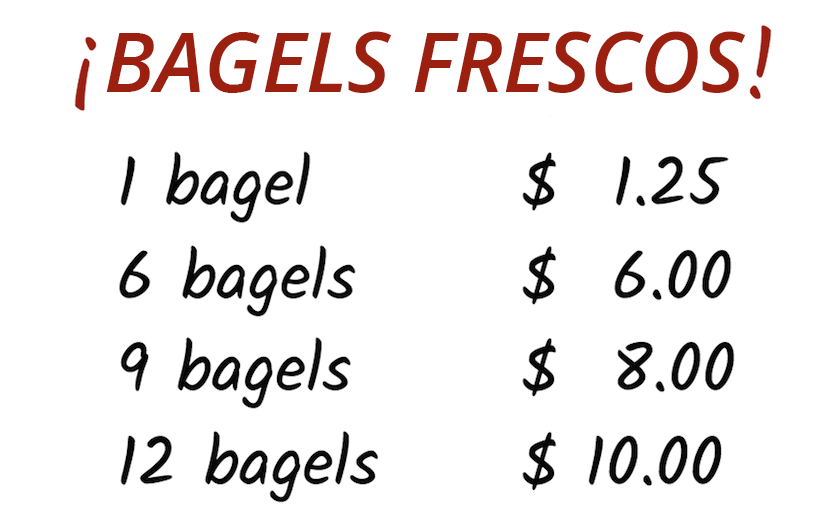 Un cliente compra 13 bagels en una tienda. El tendero dice: “Serían $16.25”.
