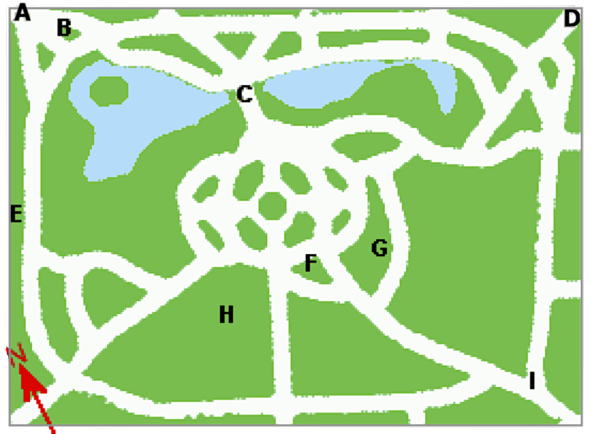 The distance from 1 dot to another horizontally or vertically represents 1 yard. Connect dots on the grid horizontally or vertically to design a small park that has 5 of these features: